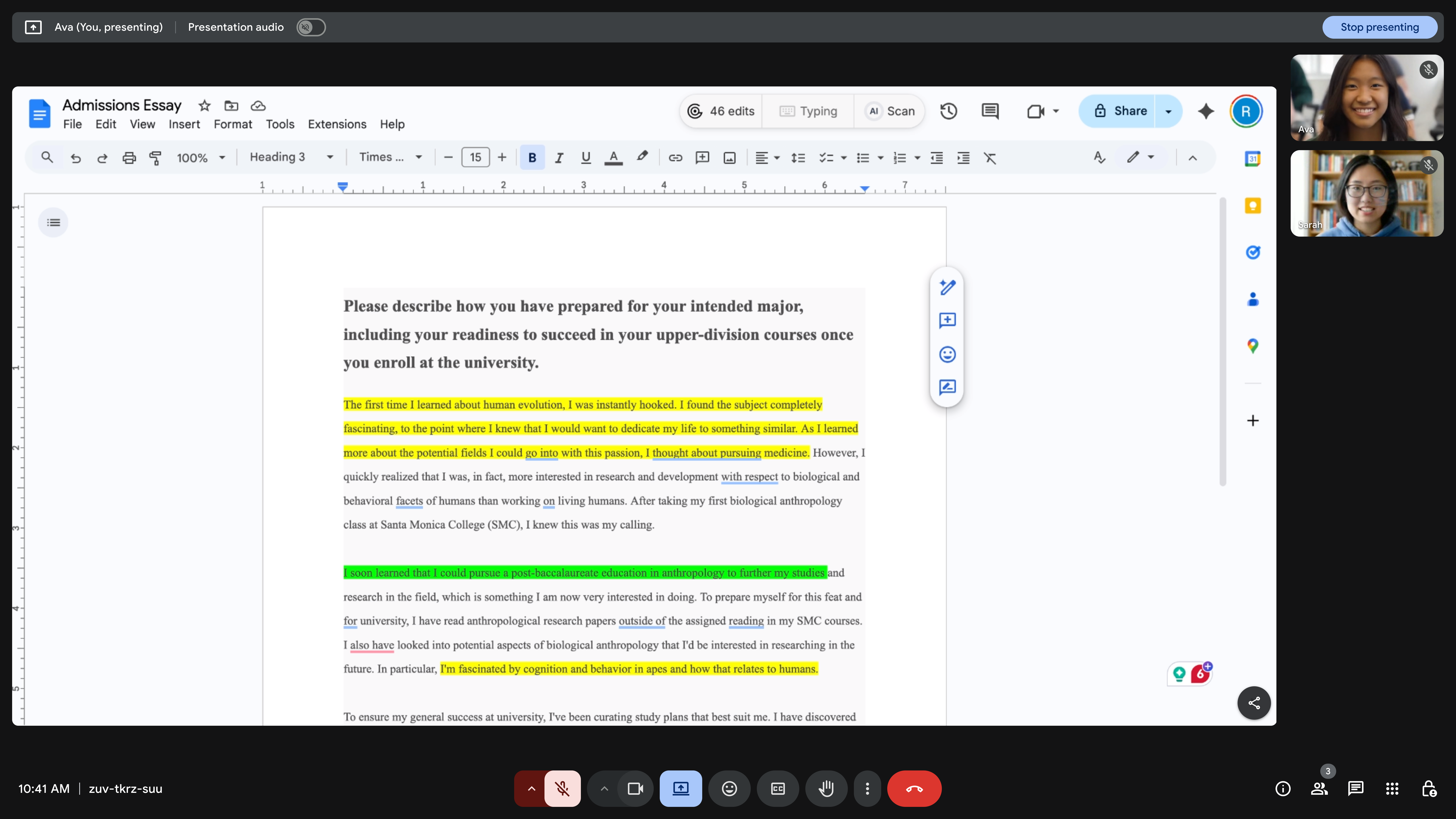 At your scheduled time, open the Google Meet link. Follow your mentor’s directions on how to share your document, and they will review it and provide live suggestions.